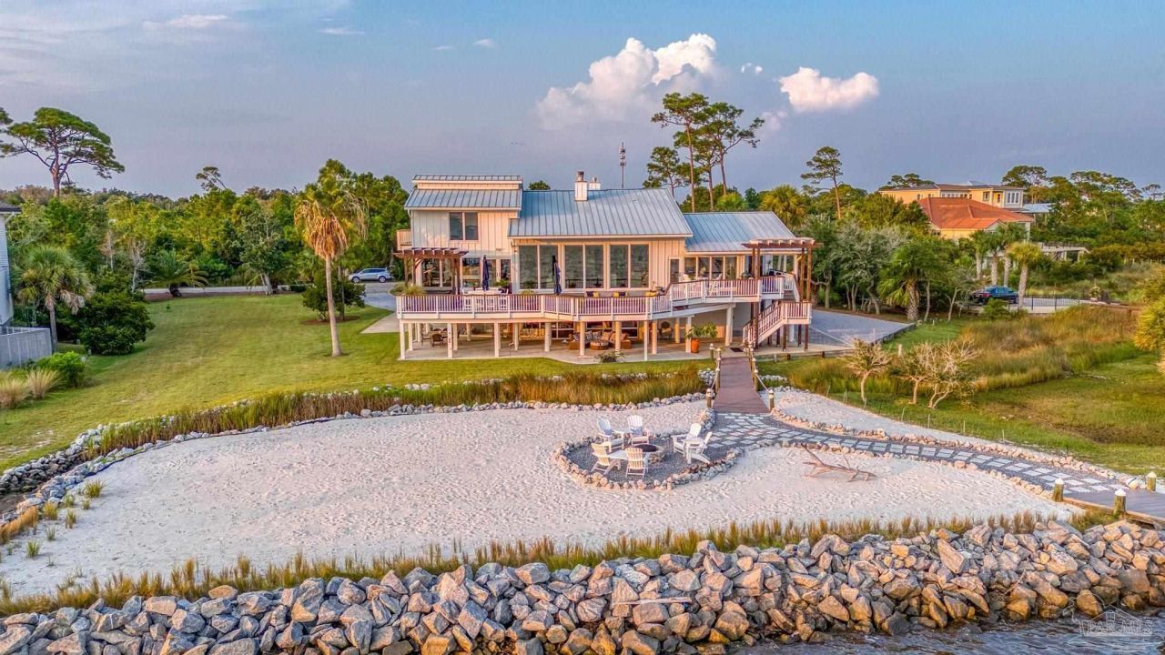 This is a rare opportunity to own a premier deep-water estate in Gulf Breeze Proper. Situated on 1.5 acres with over 200 feet on the Intracoastal Waterway, this stunning property features a rare 20x50 ft deep-water boat slip (9 ft depth) with flow-through dock and sun deck, a private white sand beach, and expansive green space. The home offers luxury throughout, including a great room with expansive windows showcasing breathtaking water views, a vaulted ceiling, and a gas fireplace. The custom kitchen is equipped with high-end appliances, a wet bar, and a dining area overlooking the Sound. The primary suite offers panoramic water views, deck/hot...read more