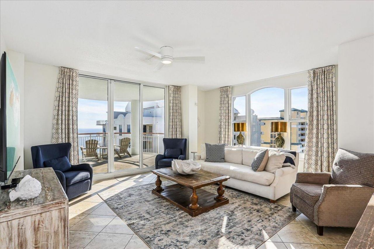 1950 Square Feet! Skyview Penthouse invites you to experience the best in waterfront living on the Gulf. Furnished 3-bedroom, 3-bath West Corner Condo on the 18th floor at Beach Colony West is ideal for primary residence, second home or investment Vacation rental. The wall of windows brings in an abundance of natural light and offers refreshing views of the white sugar sand beach and turquoise waters of the Gulf coastline. This Open concept has been thoughtfully designed with high 9-ft ceilings, crown molding, neutral color palette and spacious living area that flows directly into the expansive covered waterfront terrace. This updated condo...read more